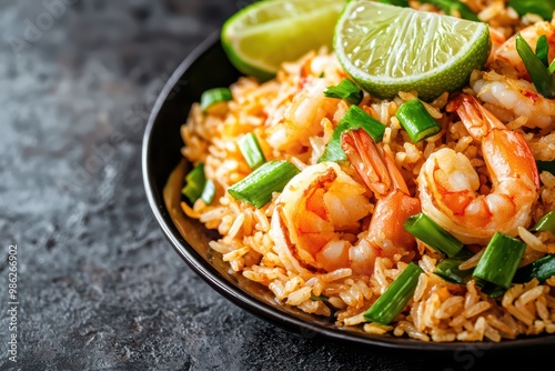 Delicious shrimp fried rice served in a black bowl with lime wedges and green onions on a dark textured surface.