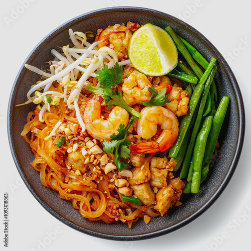 Delicious Shrimp Pad Thai with Fresh Vegetables and Lime, Featuring Crispy Tofu, Bean Sprouts, and Chopped Peanuts in a Black Bowl