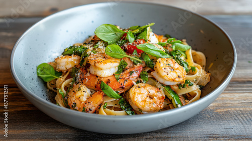 Delicious shrimp pasta dish with vibrant vegetables and fresh herbs