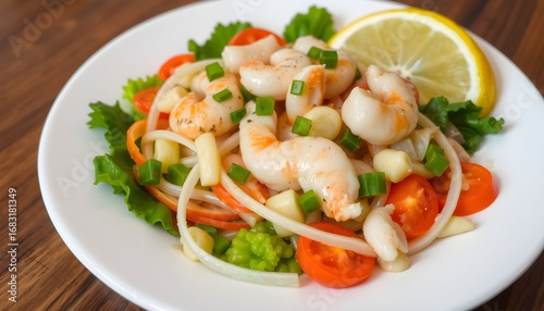 Delicious shrimp salad with noodles, cherry tomatoes, and lemon.