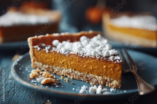 Delicious slice of pumpkin pie topped with whipped cream served on a blue plate in a cozy kitchen setting