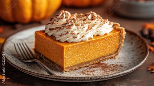 Delicious slice of pumpkin pie with whipped cream and cocoa powder.