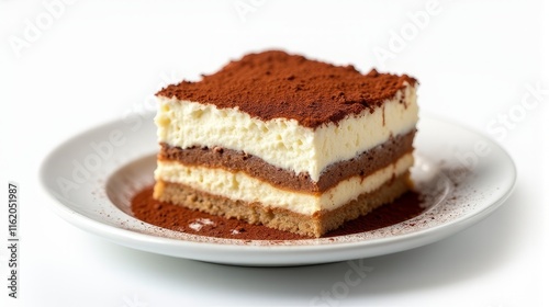 Delicious Slice of Tiramisu on a White Plate in a Studio Shot.
