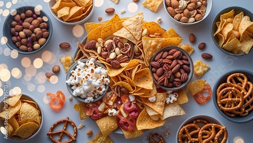 Delicious snack spread with chips, nuts, and pretzels for a cozy gathering at home
