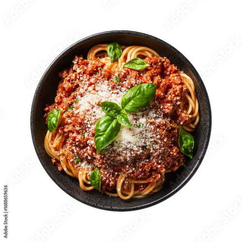 Delicious Spaghetti Bolognese in a Dark Bowl, Overhead Shot