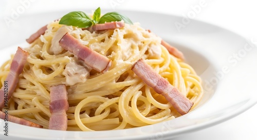 Delicious spaghetti carbonara with crispy bacon strips and fresh basil on a white plate. A culinary masterpiece, ready to be enjoyed