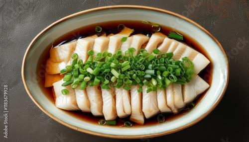 Delicious Steamed Fish with Green Onions Served in Bowl on Dark Background