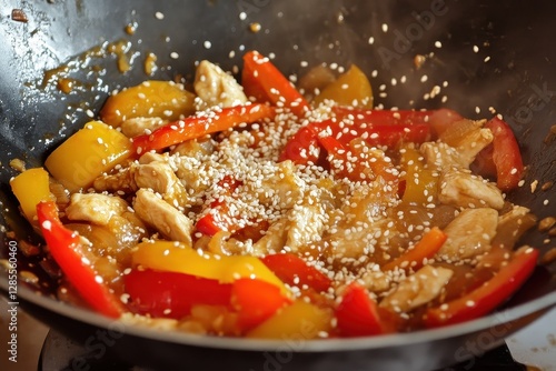 Delicious stir-fry with colorful bell peppers, tender chicken, and sesame seeds sizzling in a wok during a vibrant cooking session. Generative AI