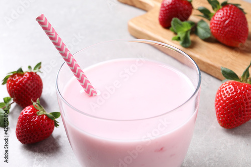 Delicious strawberry drink on light grey table, closeup