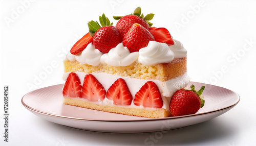 Delicious Strawberry Shortcake Slice With Fresh Strawberries And Whipped Cream On A White Isolated Background