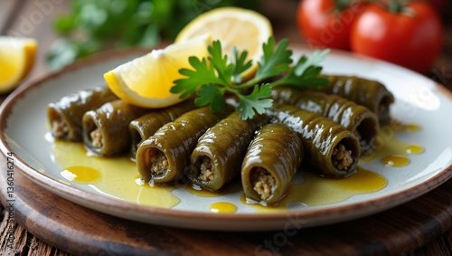 Delicious stuffed grape leaves garnished with lemon and herbs
