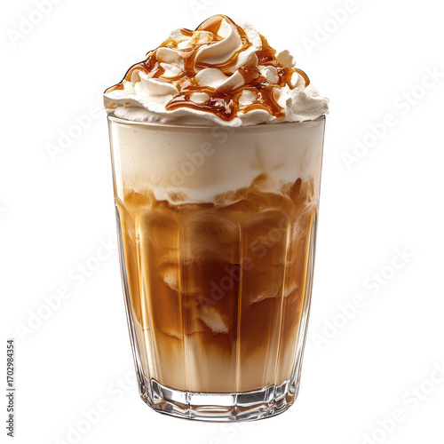 Delicious tall glass of iced latte topped with whipped cream and caramel drizzle perfect for a refreshing beverage option isolated on transparent background