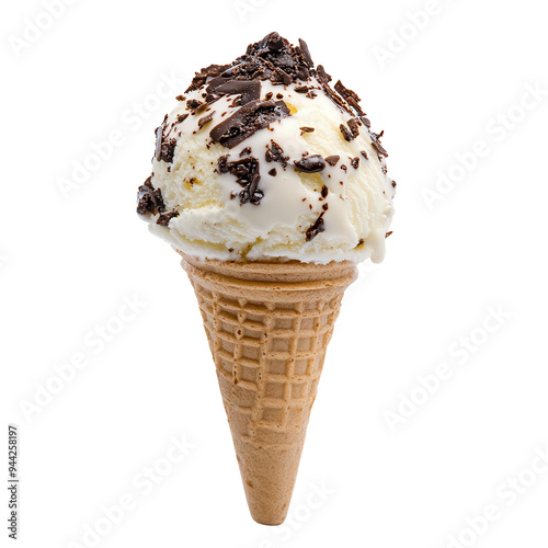 Delicious vanilla ice cream topped with chocolate sprinkles in a crispy cone, perfect for hot summer days isolate on transparency background