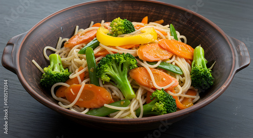 Delicious Vegetable Noodles In Rustic Bowl Presentation With Natural Lighting
