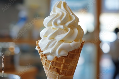 Delicious waffle cone with a dollop of whipped cream, Ice cream of vanilla, A cone of soft-serve ice cream , AI generated
