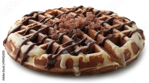 Delicious waffle topped with chocolate drizzle and caramel bits