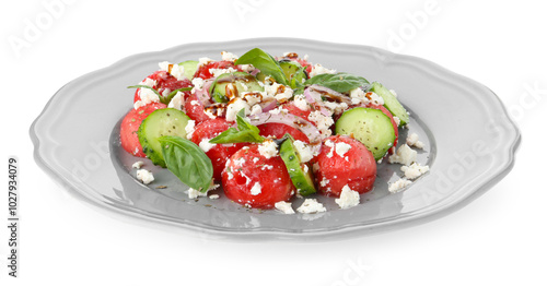 Delicious watermelon salad with feta cheese, vegetables and spices isolated on white