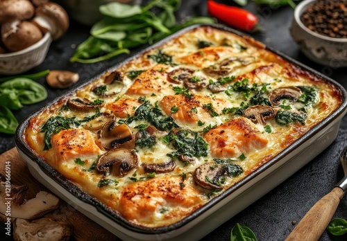 Deliciously Baked Creamy Salmon Dish with Spinach, Mushrooms, Fresh Herbs, and Cheese in Rustic Setting with Green Garnishes