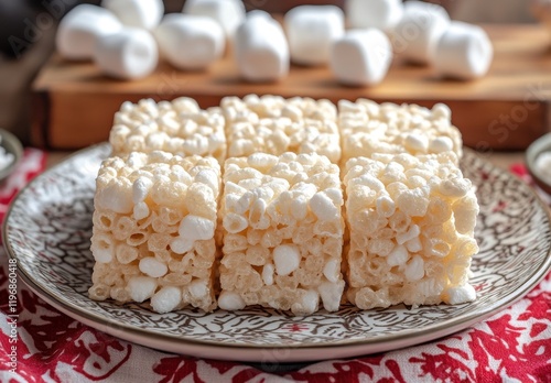 Deliciously Crafted Marshmallow Treats with Crispy Rice, Perfectly Cut into Squares on a Festively Patterned Plate Surrounded by Mini Marshmallows