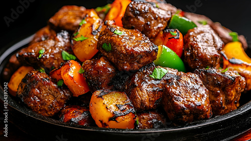 Deliciously Grilled Meat with Colorful Vegetables Served on a Sizzling Plate for an Appetizing and Flavorful Dining Experience
