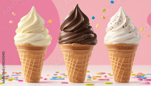 Delight in delectable ice cream display featuring three soft serve cones in vanilla, chocolate, and white flavors, surrounded by colorful sprinkles
