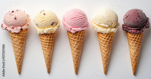 Delightful assortment of five colorful ice cream cones beautifully arranged in a flat lay composition on a clean white background