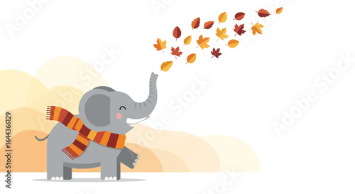 Delightful autumn illustration featuring a cartoon elephant wearing a scarf and blowing leaves creating a whimsical seasonal scene