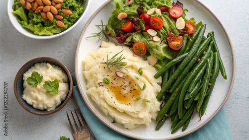Delightful Easter side dishes presented in a beautifully arranged top down view, featuring vibrant greens, creamy mashed potatoes, and fresh salads