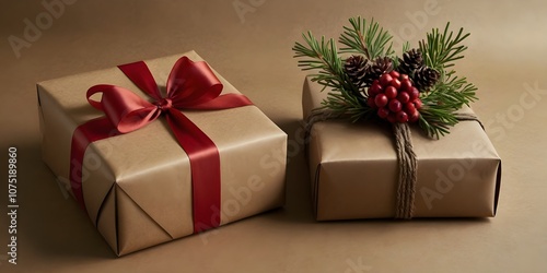 Delightful holiday gifts wrapped in golden and red paper under a beautifully adorned Christmas tree,A gift box wrapped in beige paper with a red rib. Shell and fir branch