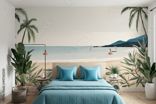 Delightful Mockup of a Light-Hued Coastal Bedroom Mural with Minimalist Design