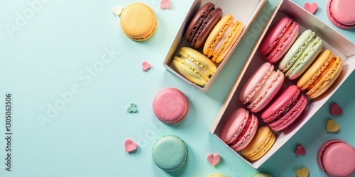 Delightful Pastel Macarons in Elegant Boxes, Adorned with Delicate Hearts on a Soft Blue Background