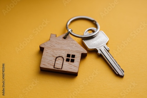 Delightful wooden house keyring paired with a key against a bright yellow background, symbolizing new beginnings and home ownership milestones