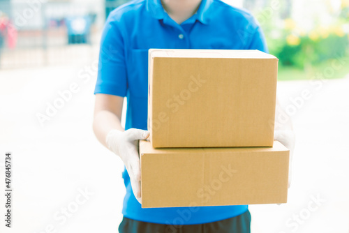 Deliver man wearing face mask in blue uniform handling yellow bag of food, fruit, milk, vegetable give to female costumer Postman and express grocery delivery service during covid19.