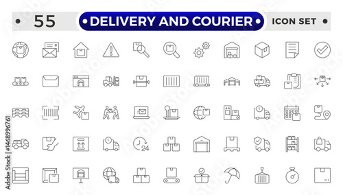 Delivery and courier icon set. Containing order tracking, delivery home, warehouse, truck, scooter, courier and cargo icons. Shipping symbol.