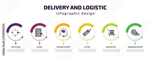 delivery and logistic infographic template with icons and 6 step or option. delivery and logistic icons such as supply chain, waybill, customer support, tax free, delivery cart, worldwide vector.