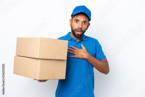 Delivery Brazilian man isolated on white background surprised and shocked while looking right