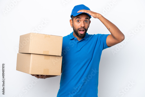 Delivery Brazilian man isolated on white background with surprise expression