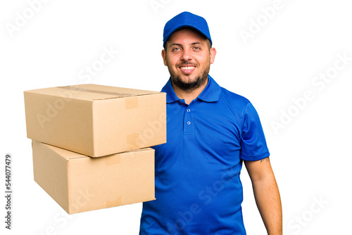 Delivery caucasian man isolated happy, smiling and cheerful.