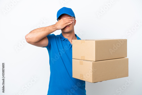 Delivery caucasian man isolated on white background covering eyes by hands. Do not want to see something