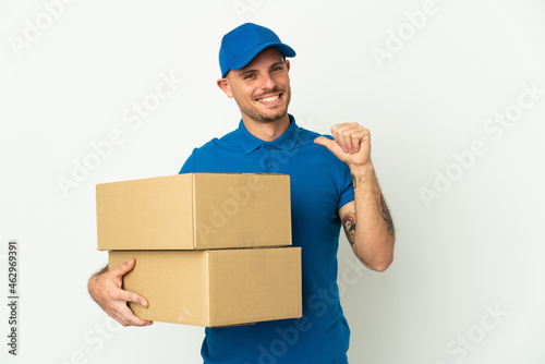 Delivery caucasian man isolated on white background proud and self-satisfied