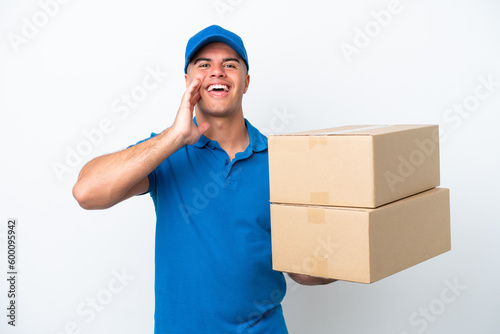 Delivery caucasian man isolated on white background shouting with mouth wide open