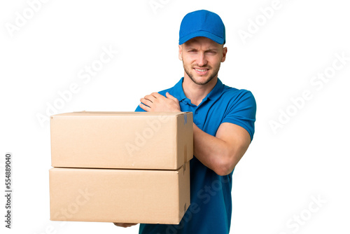 Delivery caucasian man over isolated background suffering from pain in shoulder for having made an effort