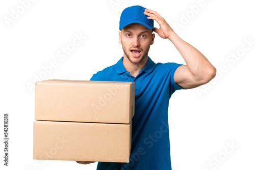Delivery caucasian man over isolated background with surprise expression