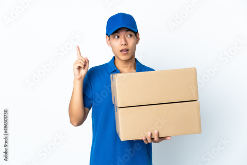 Delivery Chinese man isolated on white background intending to realizes the solution while lifting a finger up