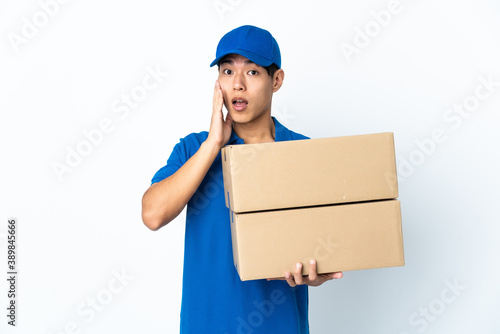 Delivery Chinese man isolated on white background with surprise and shocked facial expression