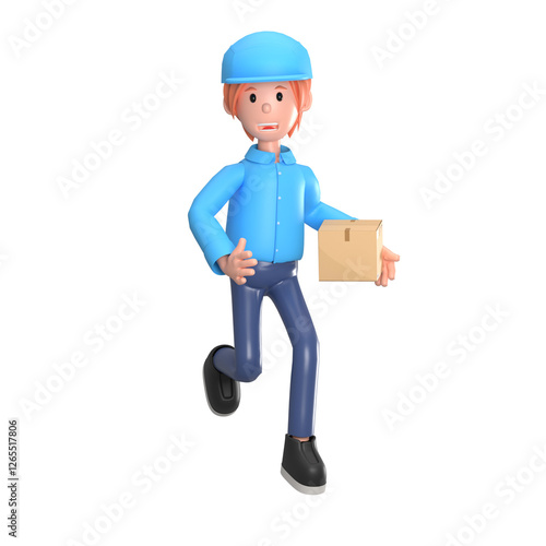 Delivery courier man in blue uniform holding cardboard package box. Safe delivery of goods concept. 3d people character illustration. Cartoon minimal style. PNG background