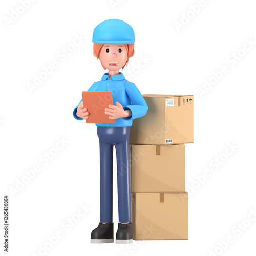 Delivery courier man in blue uniform holding clipboard. Safe delivery of goods concept. 3d people character illustration. Cartoon minimal style. PNG background