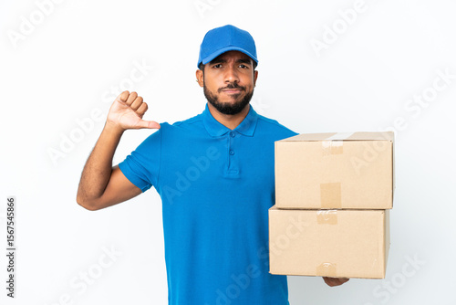Delivery Ecuadorian man isolated on white background showing thumb down with negative expression