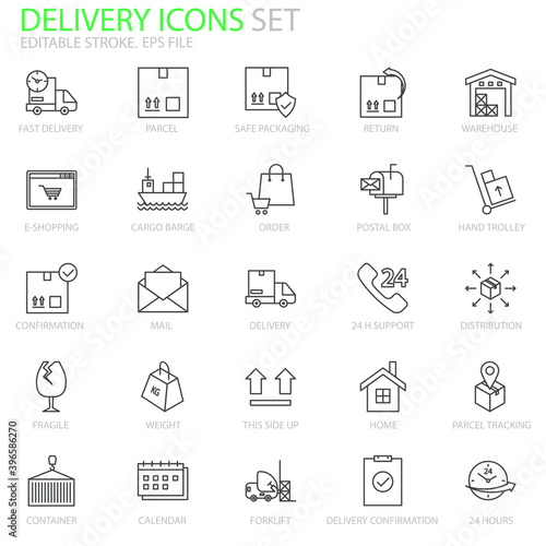 Delivery editable stroke icons set for your website, logo, app, UI, product print. Delivery concept flat Silhouette vector illustration icons set.