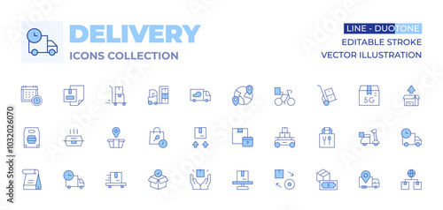 Delivery icons collection. Line Duotone style, editable stroke. purchase, planning, delivery, food delivery, lunch box, packing, cash on delivery, delivery bike, warehouse, trolley, worldwide
